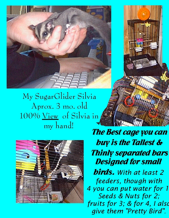 SugarGliders are known to go on motorcycle rides with their human companion. They often choose one person in the family as their soul-mate or amigo. Usually that person is the one that feeds the SugarGlider. Unshown in these pictures of the SugarGlider's cage there is a covering over the top and sides of her cage to protect her from the cold and direct sunlight My_Sugar I'm 40 years old, from Texas, USA. | |||||||||||||||||||||||